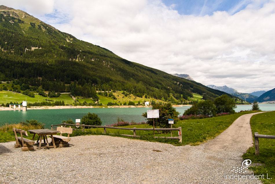 Vom Parkplatz folgen wir dem asphaltierten Weg weiter taleinwärts (kurze Strecke entlang der Staatstraße) und erreichen schließlich die ersten Häuser von Reschen (1500 m). Vorbei am Restaurant Mein Dörfl überqueren wir eine große Wiese und gelangen auf den gekennzeichneten Fahrradweg zurück. Hier dreht unsere Wanderung und wir gehen von nun an talauswärts in Richtung St. Valentin weiter. Nach einer Mühle folgen wir dem Radweg am Seeufer entlang, bis wir die Bergbahnen Schöneben erreichen. Wir überqueren die Straße und folgen dem Radweg über einen Anstieg (8-10%) und aufeinanderfolgenden Biegungen bis zu einer kleinen Kapelle beim Hofschank Giernhof (1530 m). In stetigem Auf und Ab zieht sich der Radweg nun gleichmäßig durch den Wald. Am Seeufer entlang erreichen wir schließlich nach einigen Kehren den Staudamm, über den wir zu unserem Ausgangspunkt zurückkehren.
