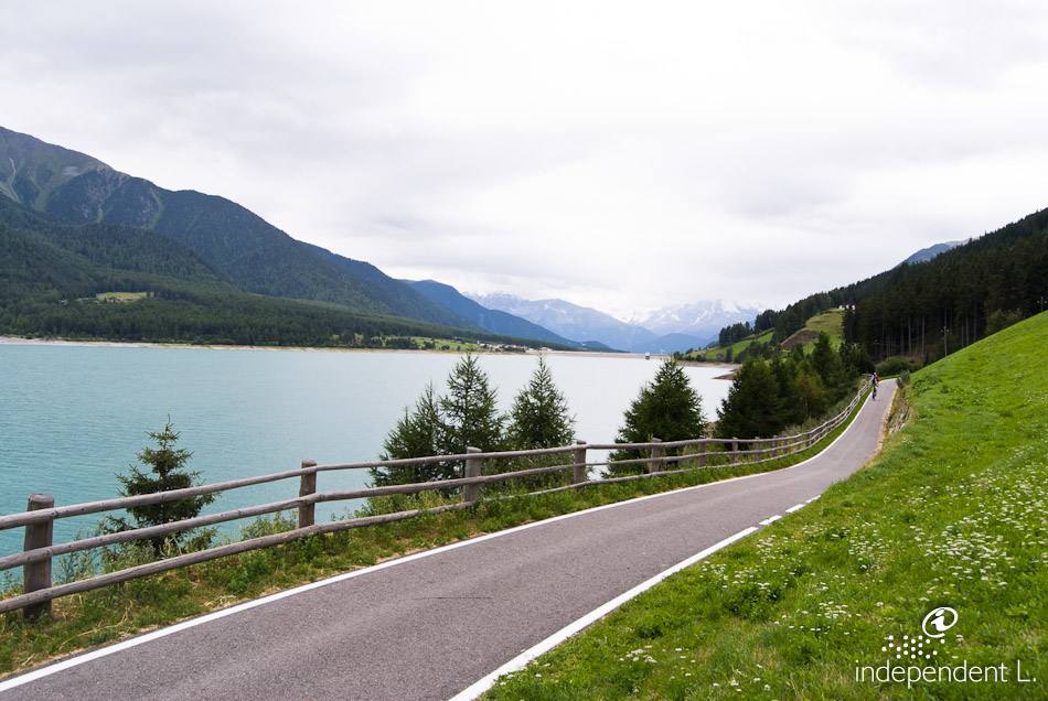 Vom Parkplatz (1502 m) führt uns der Weg auf festem Erdmaterial und Kies in Richtung Graun (1520 m, kurze Strecke entlang der Staatsstraße). Anschließend verläuft der Weg zumeist geradlinig und flach über ausgedehnte Wiesen, bis wir schließlich den Kitesurfclub Adrenalina erreichen, ein Treffpunkt für Liebhaber dieser Sportart. Nach einer kurzen Steigung gelangen wir zu einer freien Anhöhe mit Sitzbänken und Tischen, die uns einen besonders schönen Blick auf den Kirchturm ermöglicht. Ein steiler Kiesweg führt von hier aus zu einem begehbaren Steg mitten im Wasser hinunter, der Besucher rund um den Kirchturm herumführt. Geradeaus geht der Radweg hingegen eben weiter bis zum großen Besucherparkplatz, wo sich ein Kiosk und ein Infopoint über die Geschichte des Reschensees befinden.