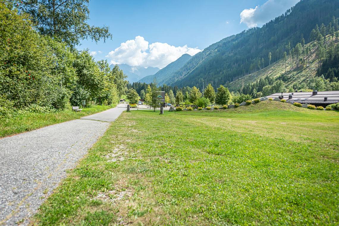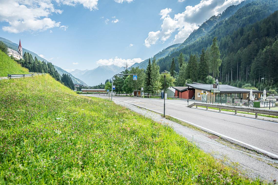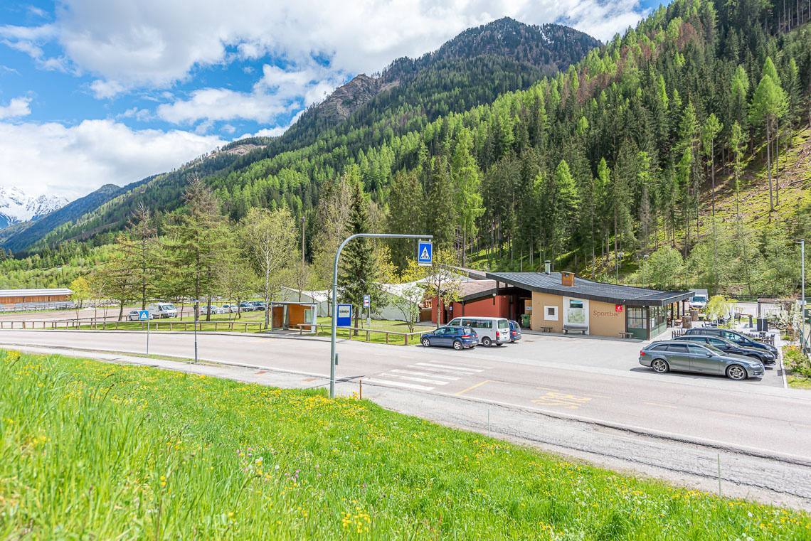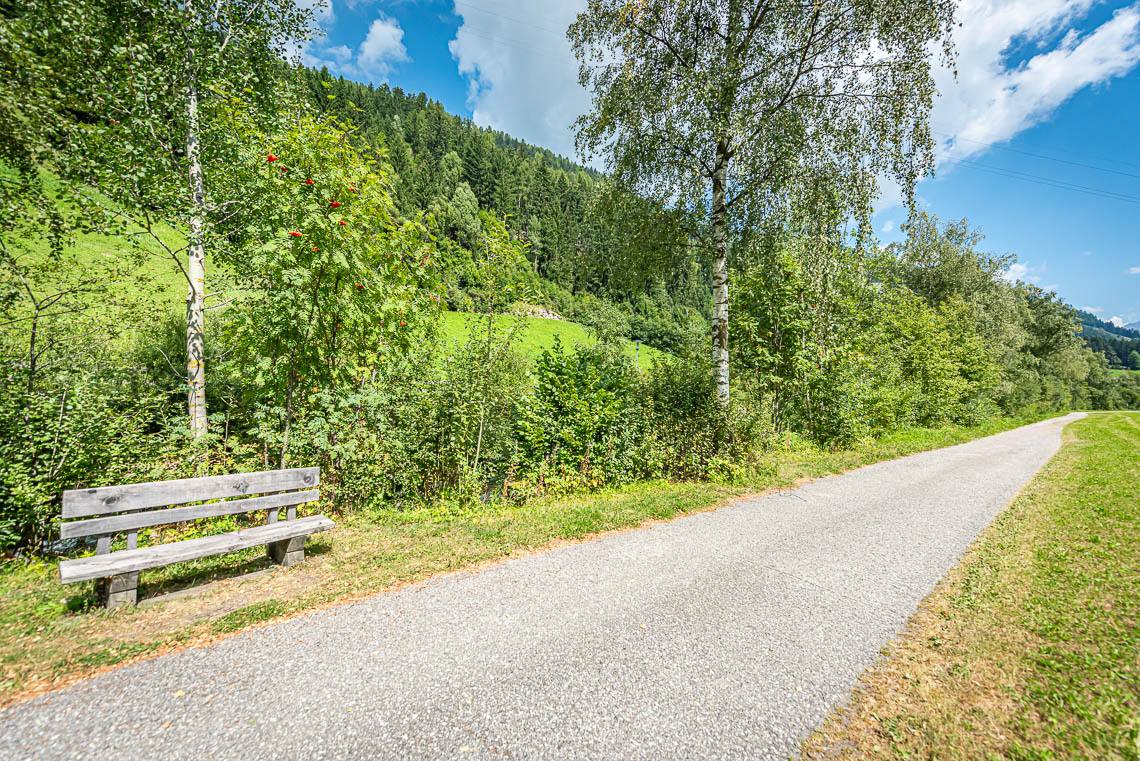 Am Wegrand laden in regelmäßigen Abständen Sitzbänke zum Verweilen ein. Bevor wir den Fußballplatz erreichen, wird der Forstweg für rund 150 m kurzfristig noch einmal etwas abschüssiger (8-10% Steigung, punktuell 15%). Beim Fußballplatz (WC in Holzhütte | nicht barrierefrei) angekommen, biegen wir links ab und überqueren die Brücke über den Mühlwalderbach und die anschließende Landesstraße (kein Zebrastreifen), um den Gehsteig an der Straße entlang zu folgen, bis hinunter zum Freizeitareal Sportbar (Picknick-Plätze, Spielplatz, kleiner Wasserlauf, barrierefreies WC ohne Haltegriff, barrierefreie Bushaltestelle, 2 Ladesäulen für Elektroautos).