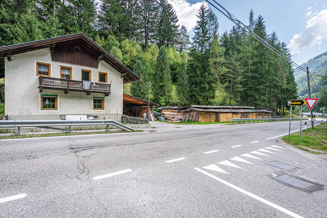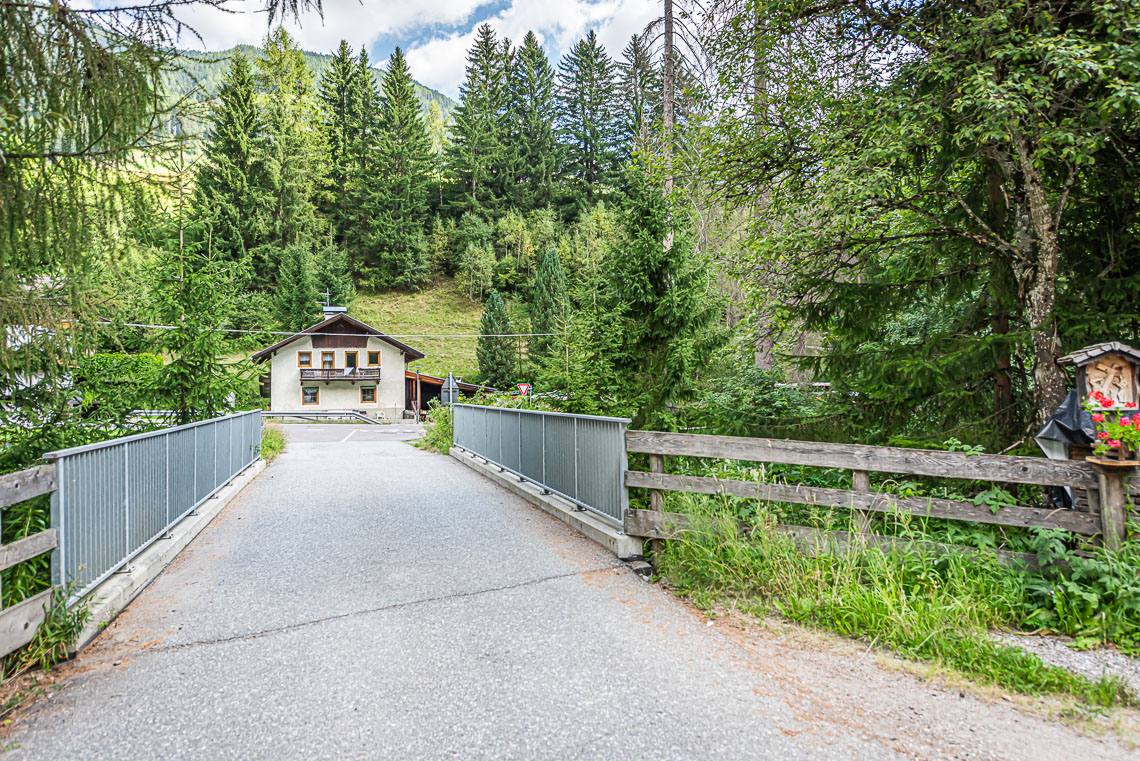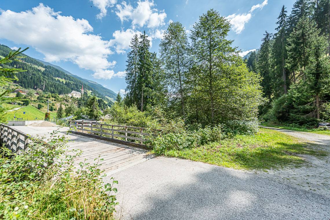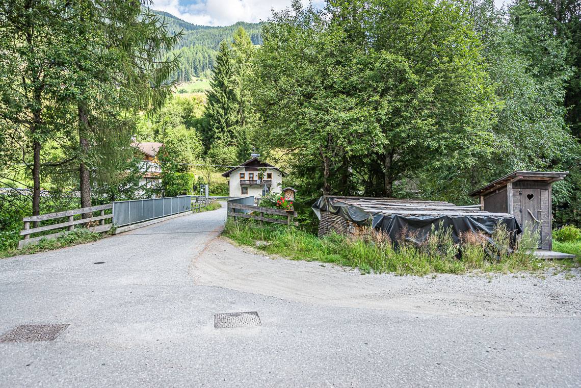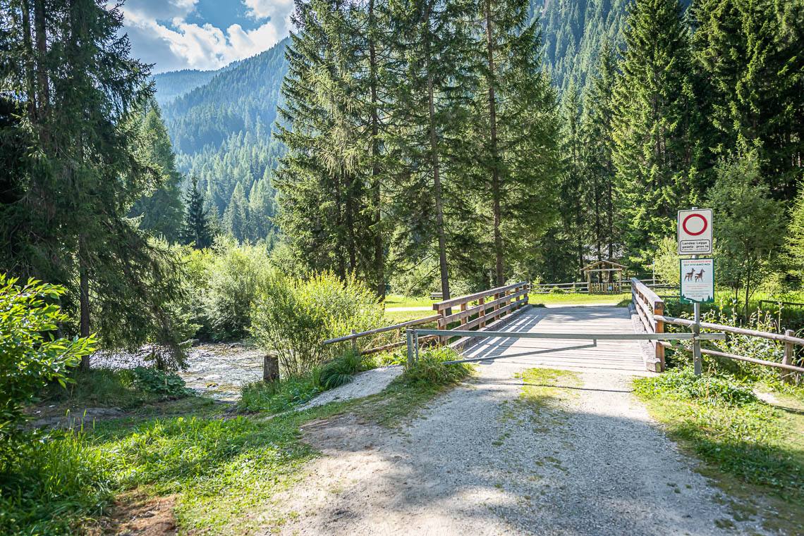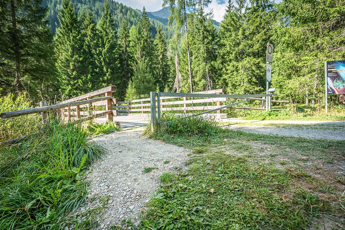 Ausgehend vom kleinen Parkplatz beim Biotop Goschta Säge (Gasteiger Säge, Viertler - taleinwärts auf der linken Straßenseite, kein reservierter Stellplatz für Menschen mit Behinderungen, barrierefreie Bushaltestelle Wassermann) passieren wir eine Durchfahrtsschranke (seitlicher Durchgang >120 cm, Querneigung 10%) und überqueren auf einer Holzbrücke den Mühlwalderbach.