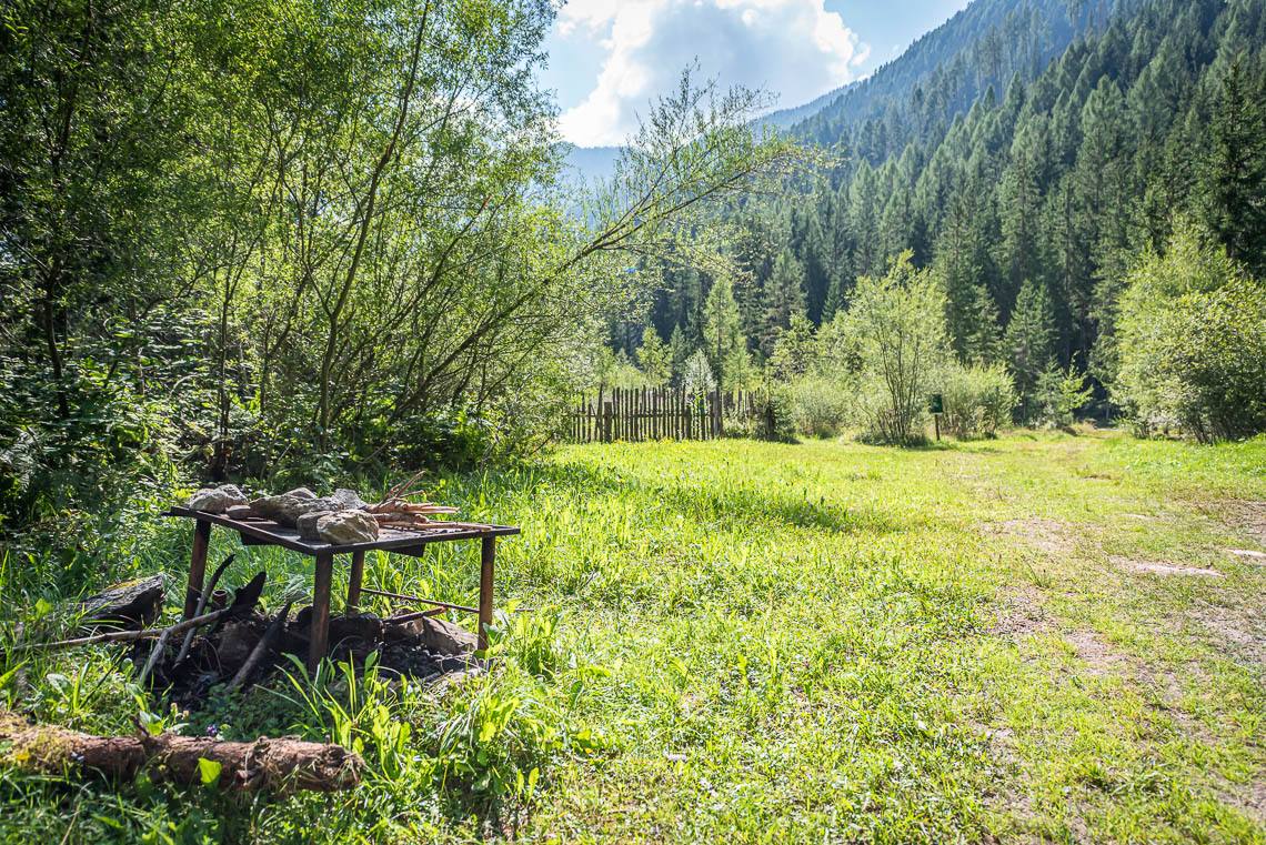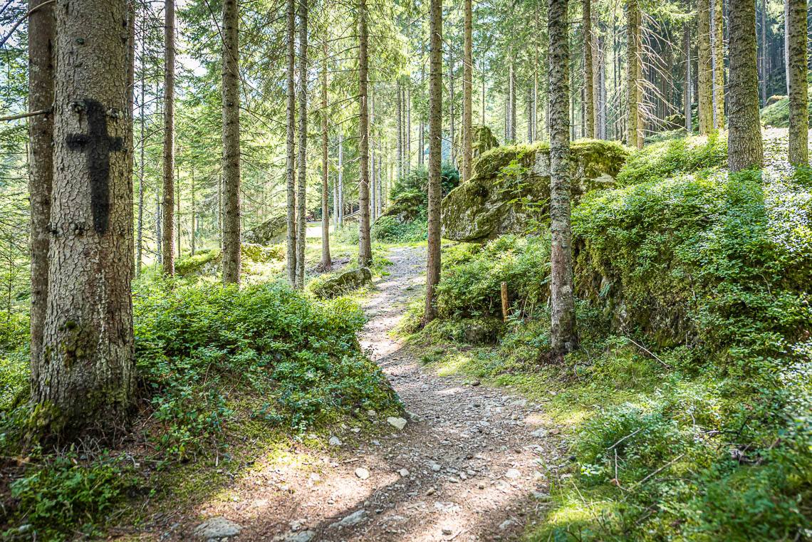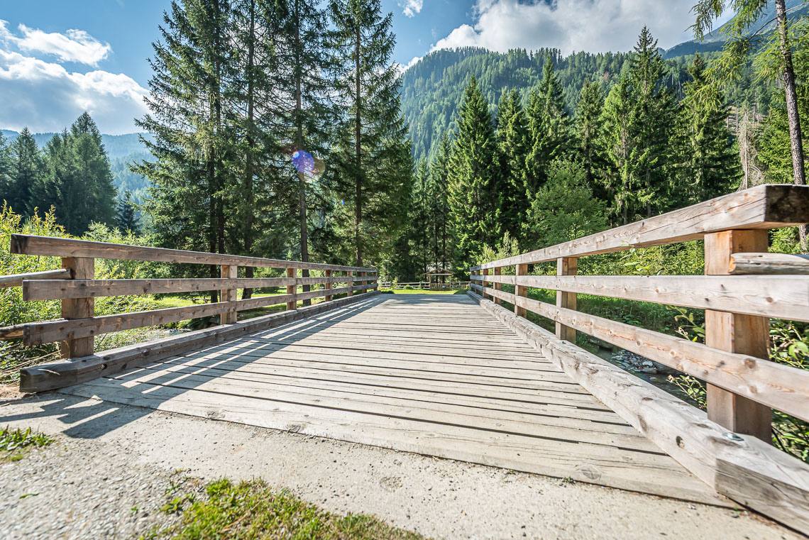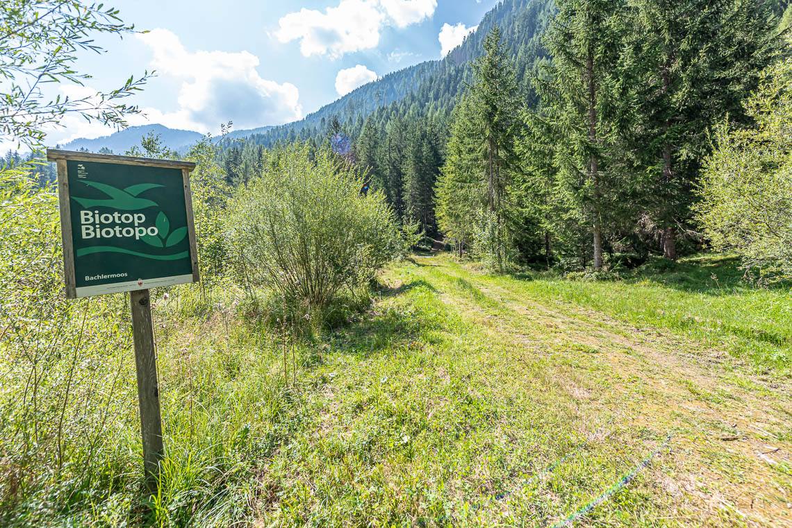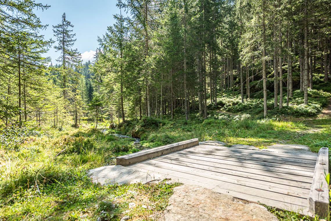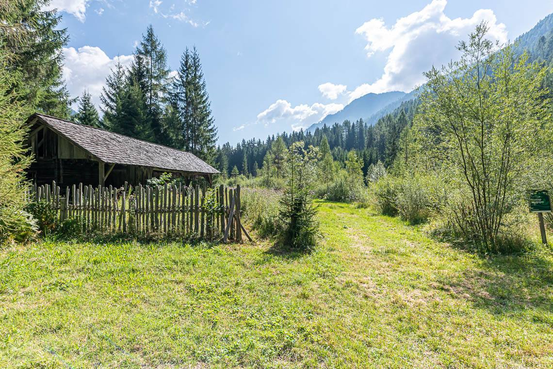 Lohnende Wegschleife um das Biotop Goschta Säge: Gleich hinter der Holzbrücke biegen wir rechts ab und folgen dem Hinweisschild Talweg zunächst taleinwärts auf einem breiten Forstweg mit Naturbelag (2 kürzere Abschnitte mit Steigung 8-10%). Bereits nach etwa 100 m verlassen wir den Forstweg und biegen links in das Biotop Goschta Säge ein. Der Weg zu diesem naturbelassenen Moorbiotop, an dessen Rand auch die ehemalige Venezianersäge Goschta Säge (nicht zugänglich) steht, verläuft durch eine sonnige Waldwiese über einen unbefestigten Fahrweg mit Grasbelag, der einige holprige Passagen aufweist und insbesondere bei Regen aufgeweichte Abschnitte haben kann. Nachdem wir ein kleines Bächlein auf einem Holzsteg überqueren, verlassen wir den bisherigen Fahrweg und folgen links dem schmaleren Waldweg talauswärts (> 120 cm, holpriger Bodenbelag aufgrund von Wurzeln und Steinen, 2 m lange Steigung 15%, anschließendes Auf und Ab mit einem rund 25 m langen Abschnitt von 10-15%).