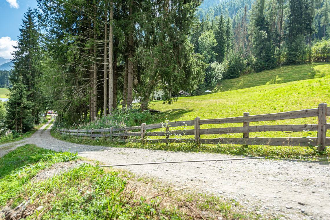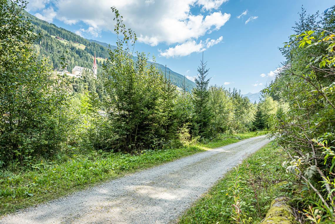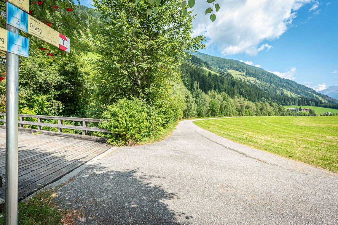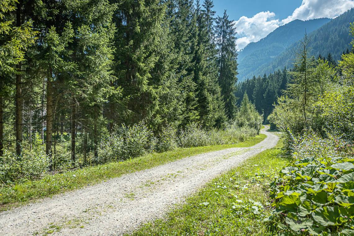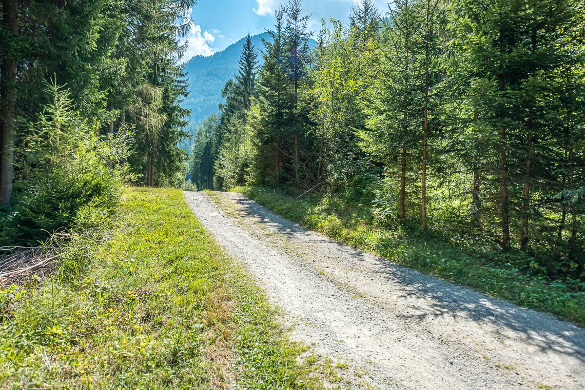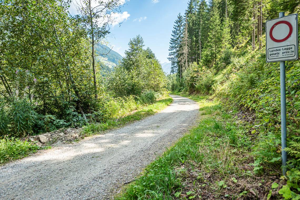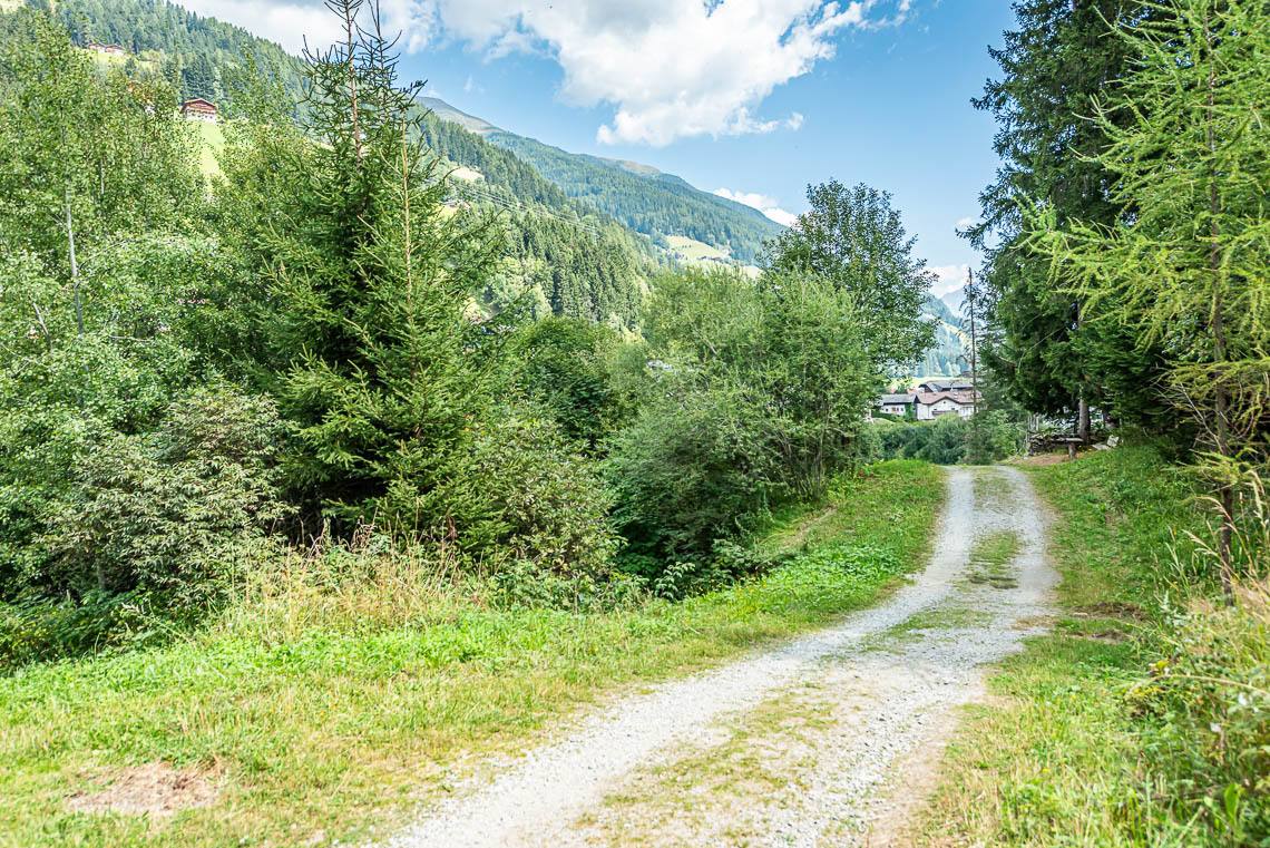 Beim Bauhof der Gemeinde Mühlwald, oberhalb des Freizeitareals Sportbar, überqueren wir auf einer Holzbrücke den Mühlwalderbach und folgen links dem ausgeschilderten Talweg talauswärts: Der Forstweg mit Kiesbelag verläuft jenseits des Mühlwalder Baches am Waldrand entlang durch eine abwechslungsreiche Flora voller Orchideen. Am Wegrand entlang gibt immer wieder Sitzbänke. Der Wegverlauf ist Großteils recht gleichmäßig, aber beinhaltet einen moderaten Anstieg (100 m 8%) und zwei aufeinanderfolgende Abschnitte, in denen der Weg markant abfällt (20 m 15%, 50 m 15%) bis wir schließlich über eine rund 200 m lange eingezäunten S-Kurve zur Garage Seeber in Mühlwald Dorf hinuntergelangen (barrierefreie Bushaltestelle).