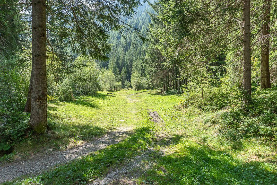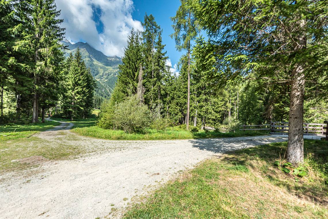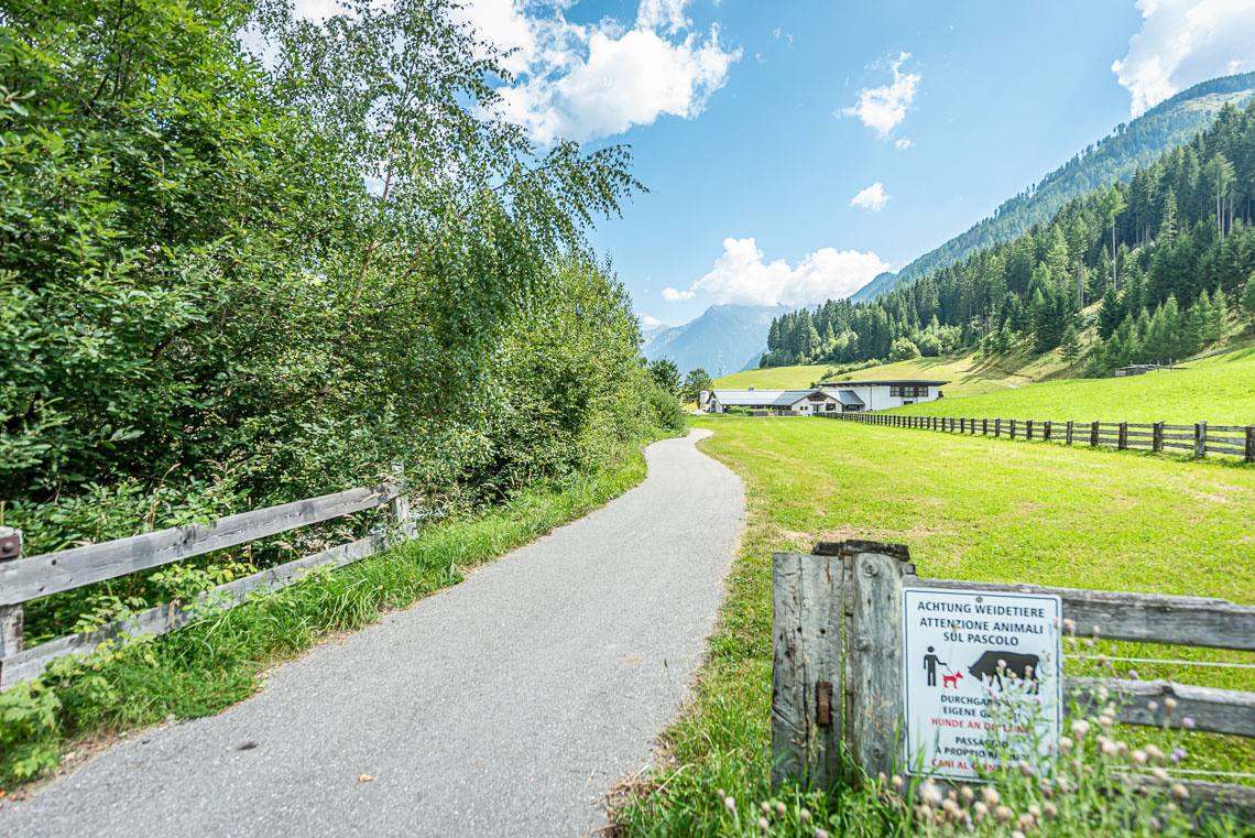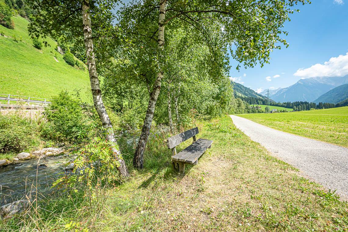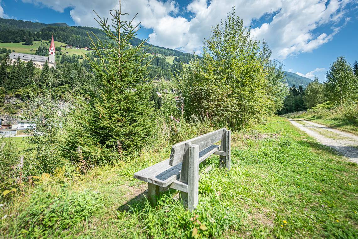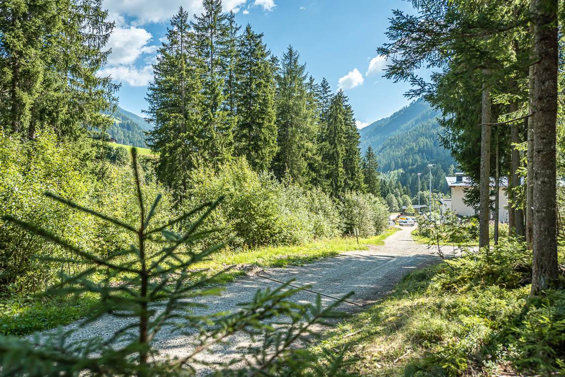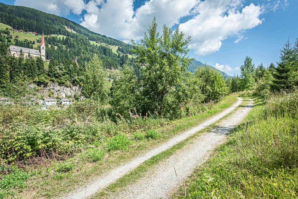 Beim Bauhof der Gemeinde Mühlwald, oberhalb des Freizeitareals Sportbar, überqueren wir auf einer Holzbrücke den Mühlwalderbach und folgen links dem ausgeschilderten Talweg talauswärts: Der Forstweg mit Kiesbelag verläuft jenseits des Mühlwalder Baches am Waldrand entlang durch eine abwechslungsreiche Flora voller Orchideen. Am Wegrand entlang gibt immer wieder Sitzbänke. Der Wegverlauf ist Großteils recht gleichmäßig, aber beinhaltet einen moderaten Anstieg (100 m 8%) und zwei aufeinanderfolgende Abschnitte, in denen der Weg markant abfällt (20 m 15%, 50 m 15%) bis wir schließlich über eine rund 200 m lange eingezäunten S-Kurve zur Garage Seeber in Mühlwald Dorf hinuntergelangen (barrierefreie Bushaltestelle).