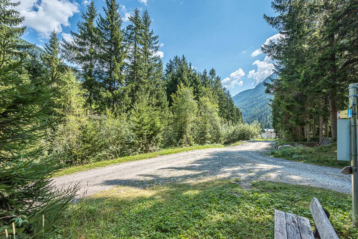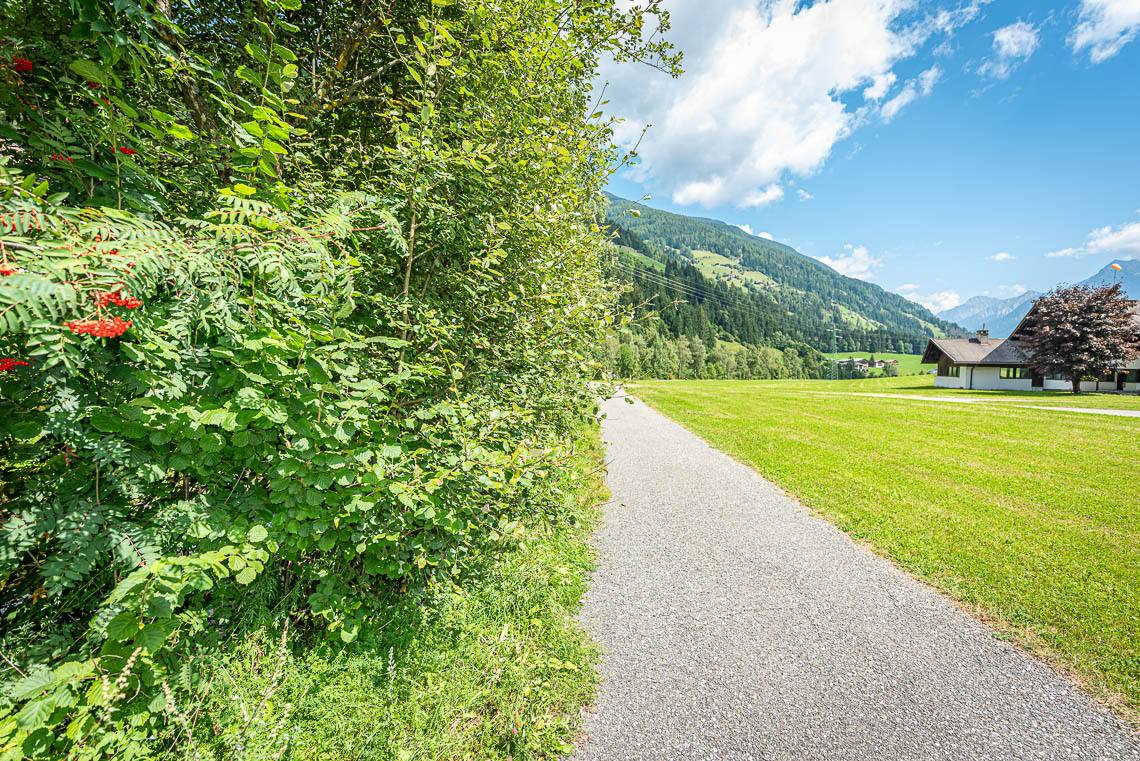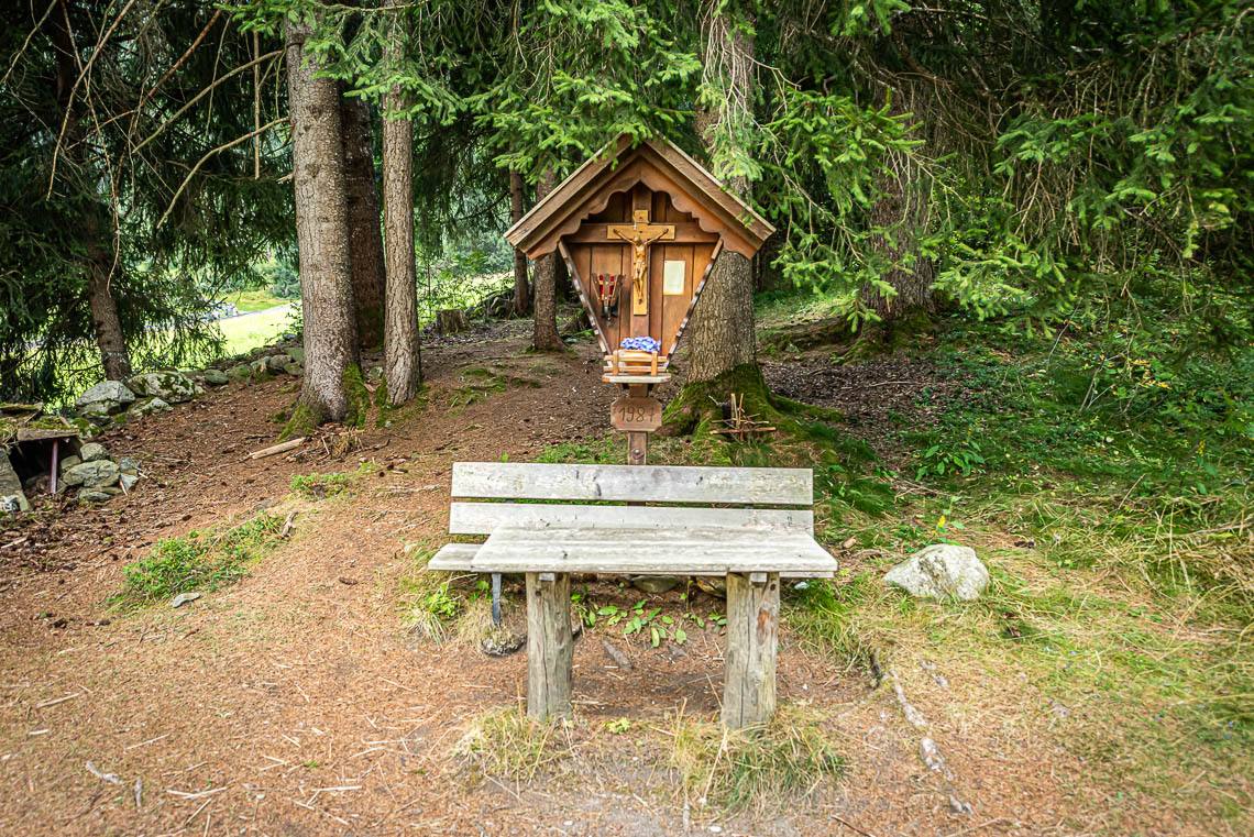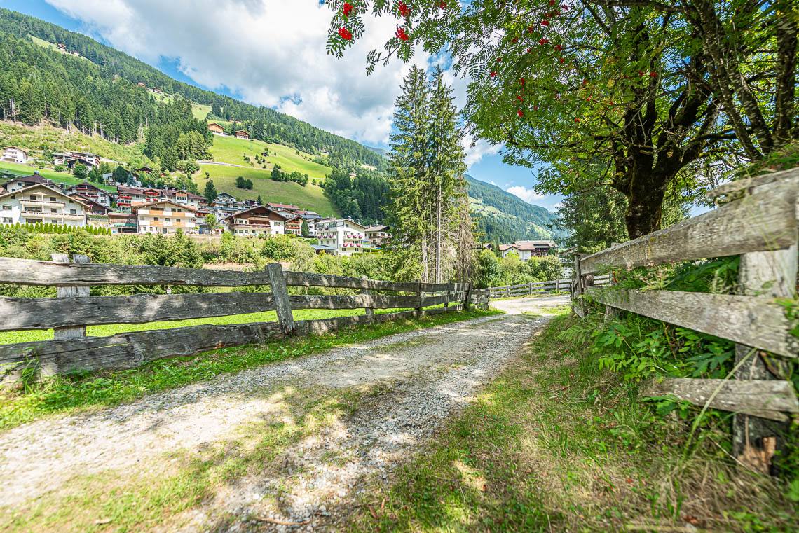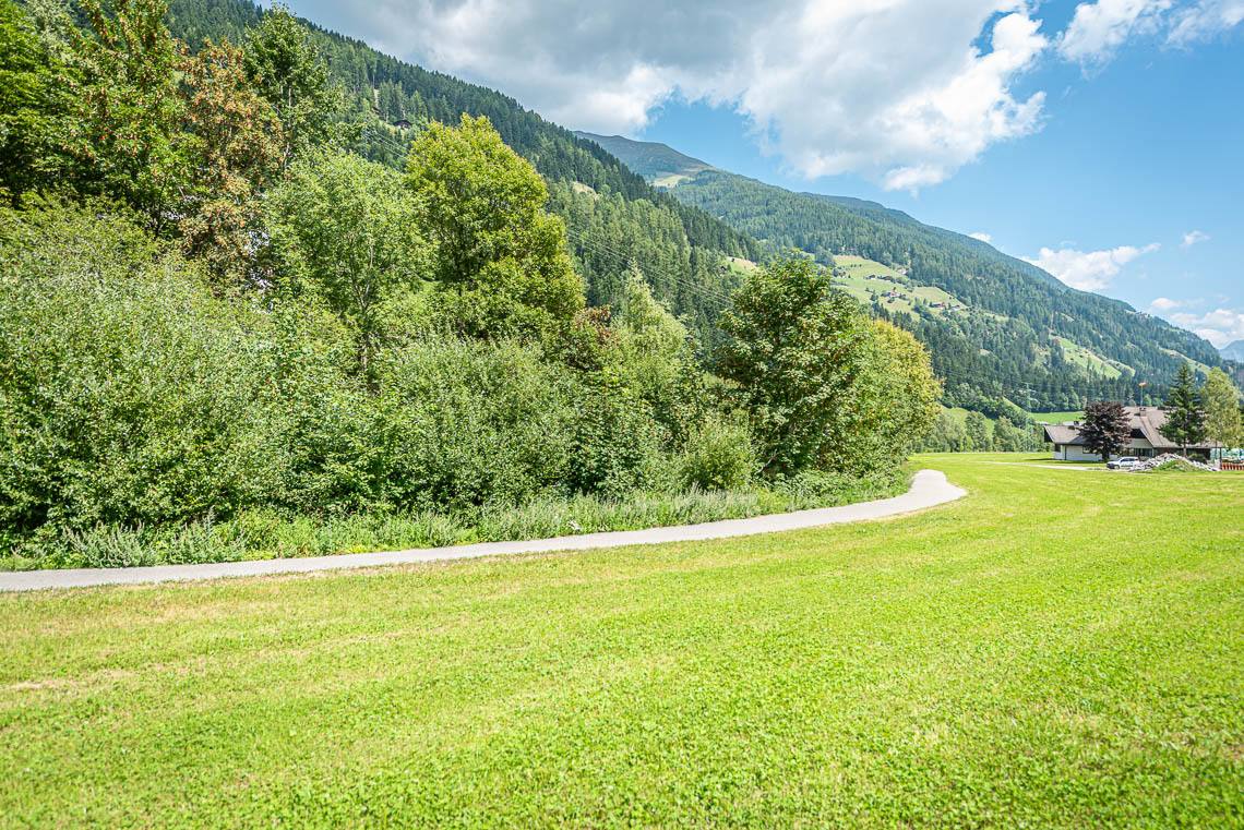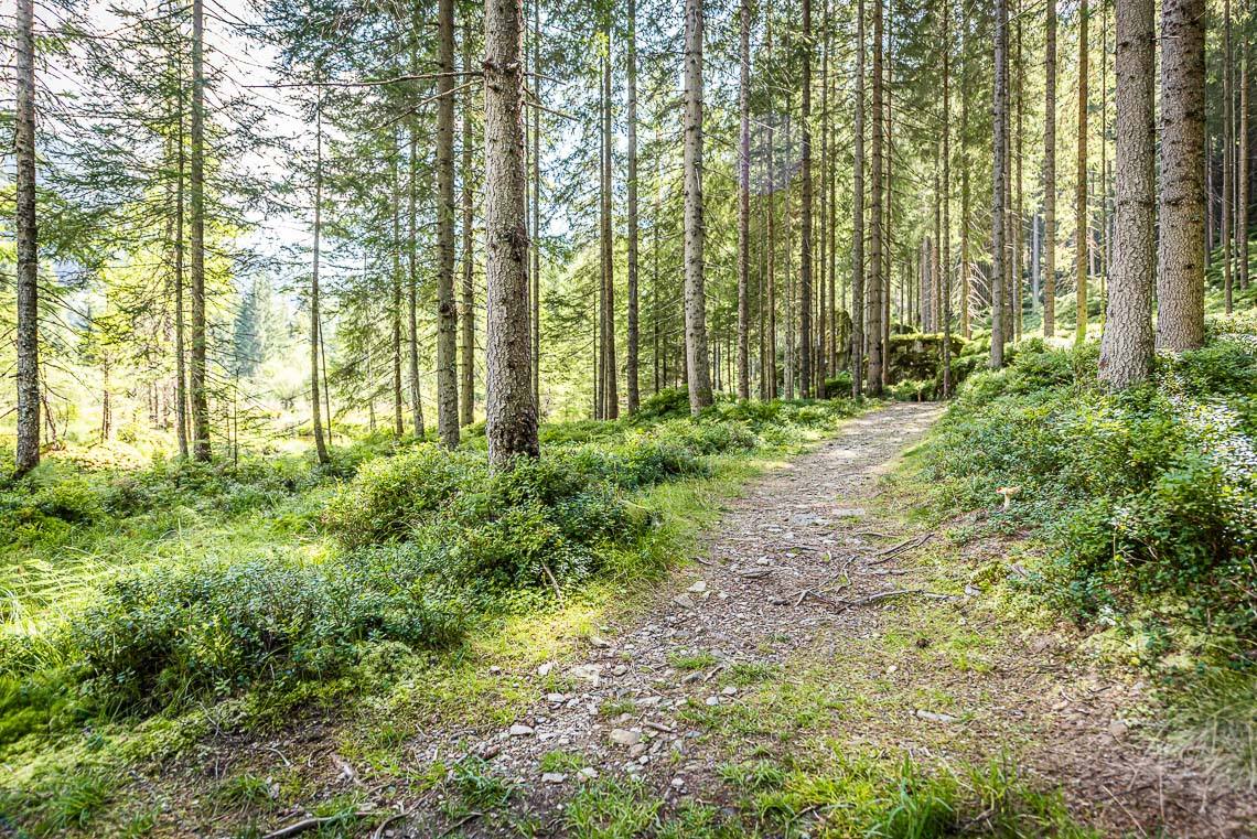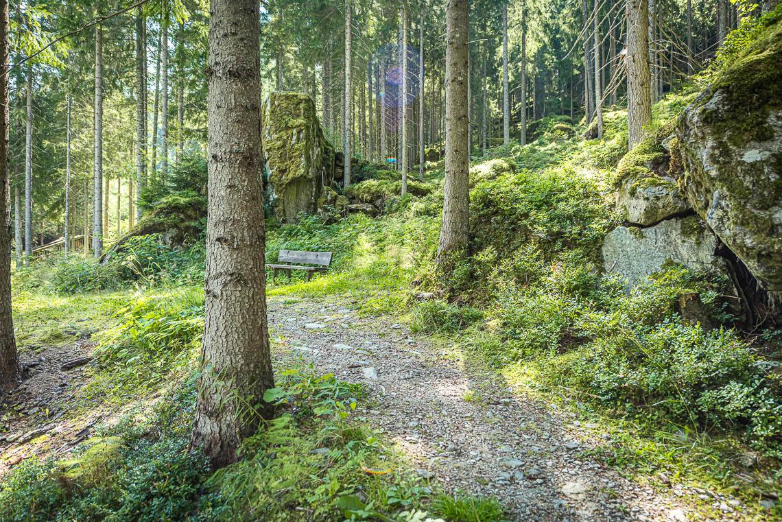 Beim Bauhof der Gemeinde Mühlwald, oberhalb des Freizeitareals Sportbar, überqueren wir auf einer Holzbrücke den Mühlwalderbach und folgen links dem ausgeschilderten Talweg talauswärts: Der Forstweg mit Kiesbelag verläuft jenseits des Mühlwalder Baches am Waldrand entlang durch eine abwechslungsreiche Flora voller Orchideen. Am Wegrand entlang gibt immer wieder Sitzbänke. Der Wegverlauf ist Großteils recht gleichmäßig, aber beinhaltet einen moderaten Anstieg (100 m 8%) und zwei aufeinanderfolgende Abschnitte, in denen der Weg markant abfällt (20 m 15%, 50 m 15%) bis wir schließlich über eine rund 200 m lange eingezäunten S-Kurve zur Garage Seeber in Mühlwald Dorf hinuntergelangen (barrierefreie Bushaltestelle).