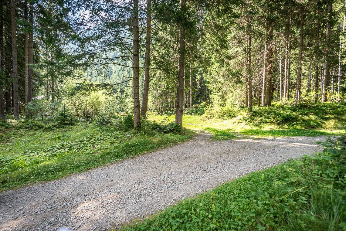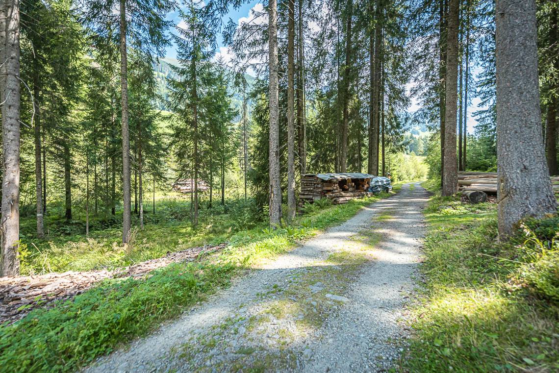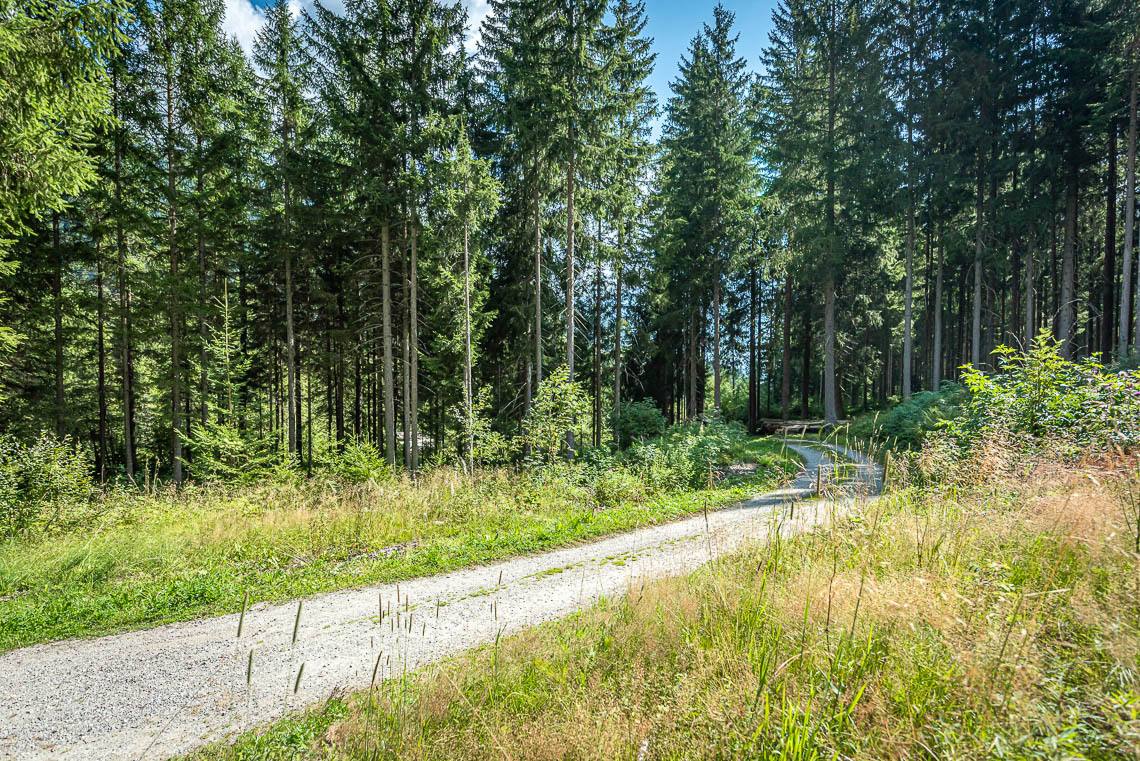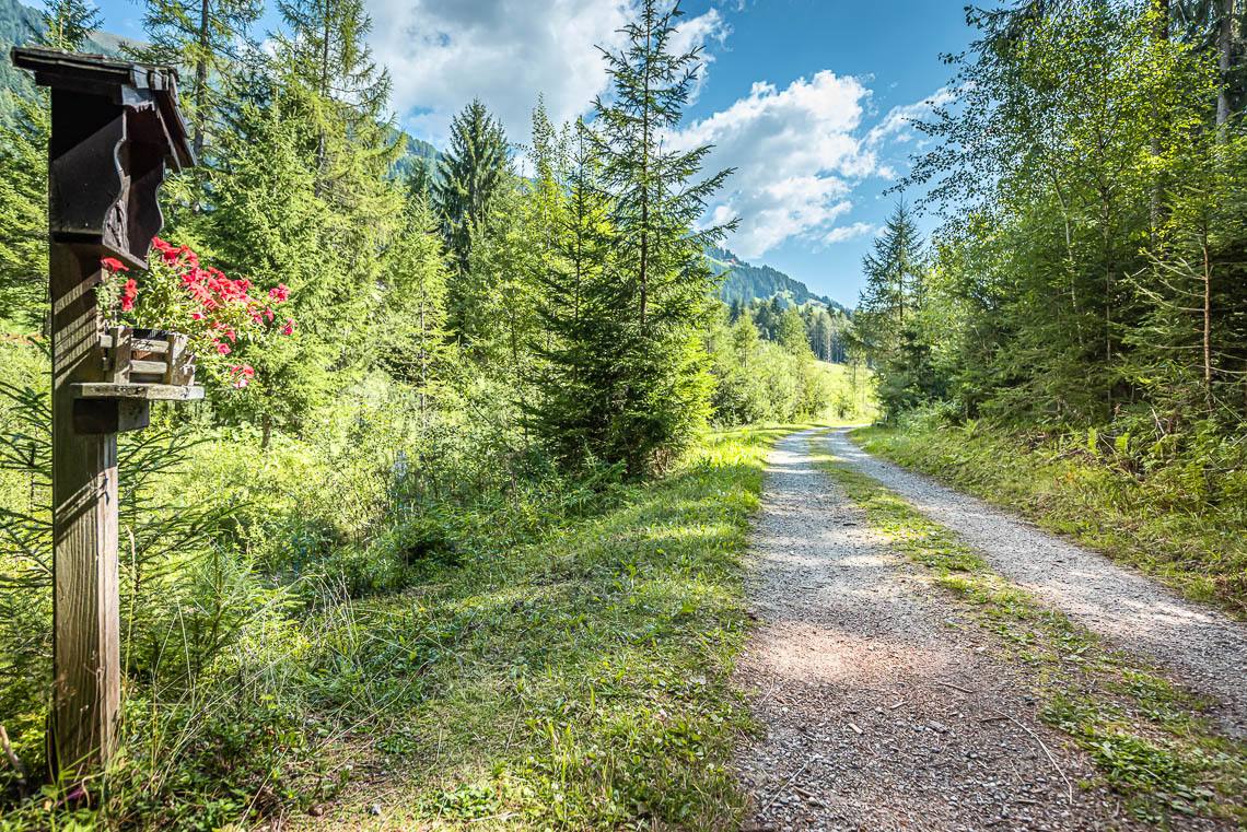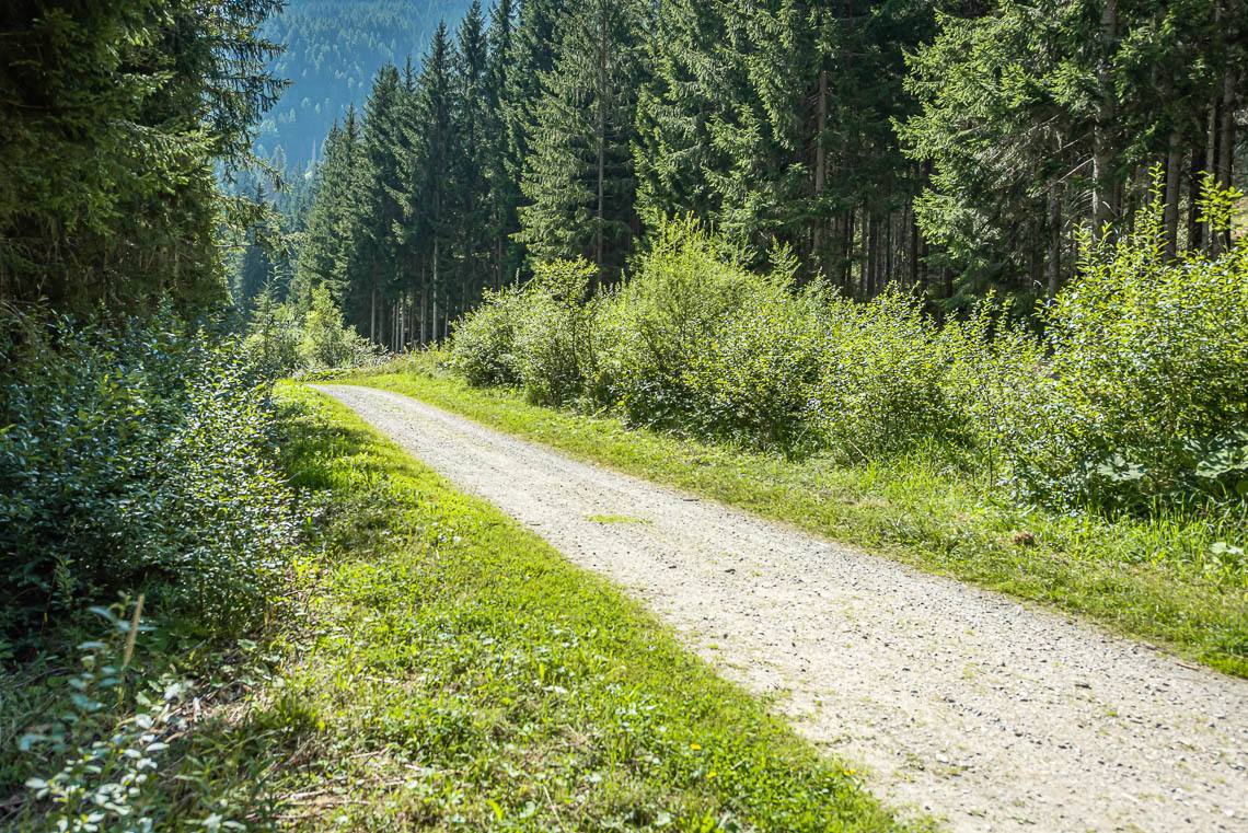 Wem die oben beschriebene Wegschleife um das Biotop Goschta Säge zu schwierig sein sollte, der kann von der Holzbrücke beim Parkplatz Goschta Säge auch einfach gleich links abbiegen und dem ausgeschilderten Talweg (Forststraße mit Kiesbelag) talauswärts folgen. Der weitere Verlauf der Forststraße (Schotterweg, mittig mit Gras bewachsen) beinhaltet mehrere gleichmäßige Anstiege (50 m 8%, 20 m 8%, 15 m 12%) und jeweils darauffolgende Weggefälle (50 m 12%, 20 m 10%, 15 m 12%).