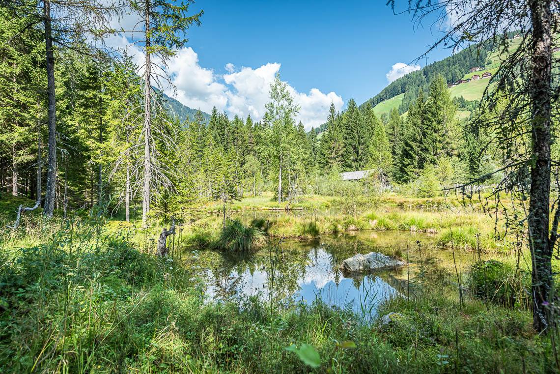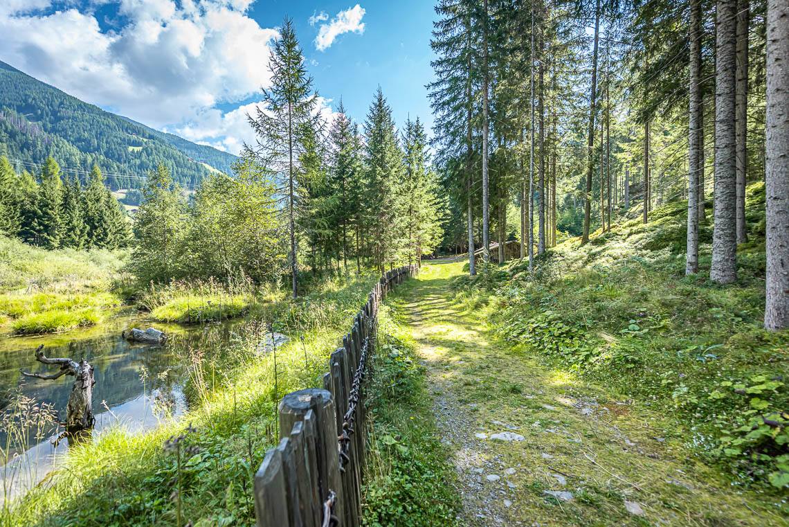 Diese lohnenswerte Wanderung im Mühlwaldertal, einem ruhigen Seitental des Tauferer Ahrntales, beginnt hinter der Berggemeinde Mühlwald, auf rund 1.230 m, beim Biotop Goschta Säge und folgt dem beliebten Talweg talauswärts bis zum kinderfreundlichen Freizeitareal Sportbar (Picknick-Plätze und kleiner Wasserlauf) und weiter bis zum idyllischen Mühlwalder See (barrierefreier Seerundweg).Die insgesamt rund 3,5 km lange Strecke lässt sich auch in 3 kürzere Wegabschnitte unterteilen, die jeweils auch mit dem öffentlichen Bus (Linie 451) barrierefrei erreichbar sind: