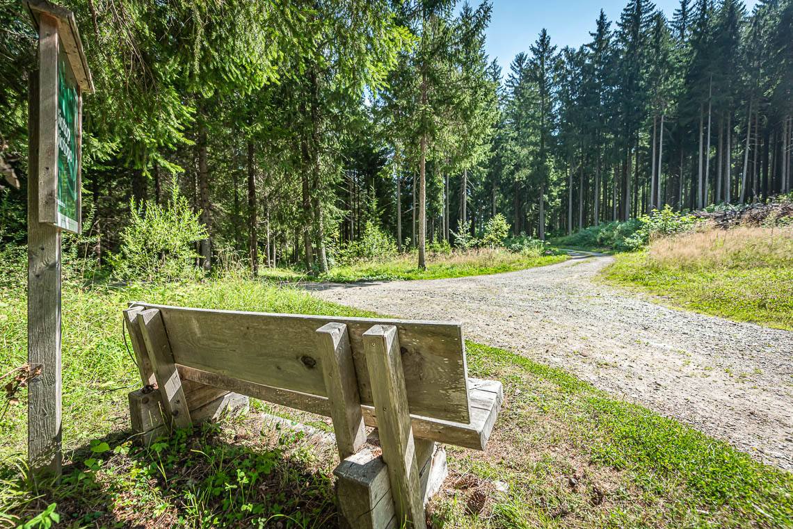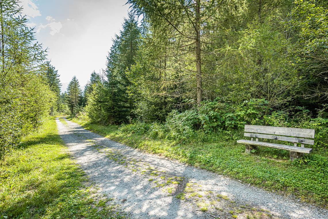 Nun folgen wir der Holzeinzäunung des Biotops auf der linken Seite, bis wir bei einer Sitzbank wenig später wieder auf den ursprünglichen Talweg treffen, der uns von hier aus als breiter Forstweg mit Kiesbelag weiter talauswärts führt.