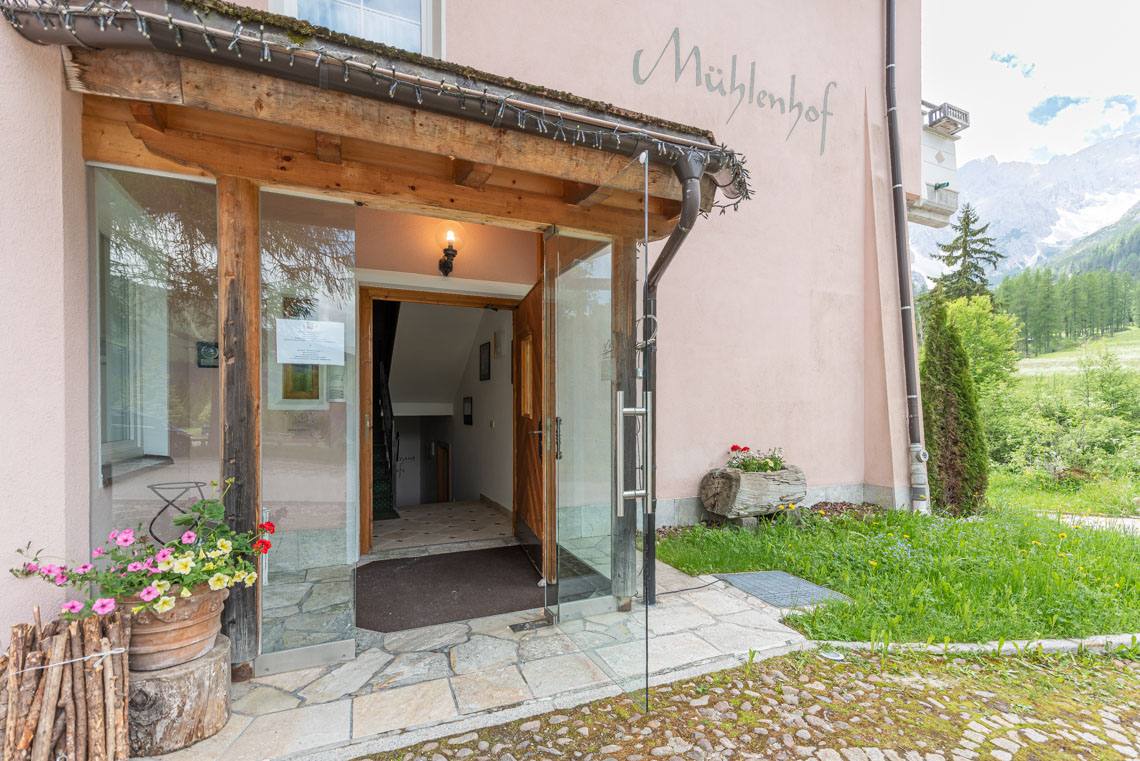 Das Mühlenhof gehört zum benachbarten Hotel Bad Moos Dolomites Spa Resort und verfügt über einen großen Parkplatz mit Kiesbelag vor dem Haus. Über einen ebenen Zugangsweg mit holprigem Pflasterbelag gelangt man stufenlos zum Eingangsbereich mit Aufzug (120x90 cm).