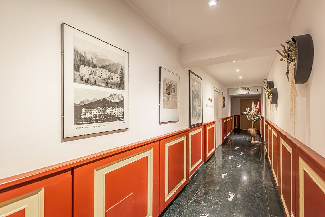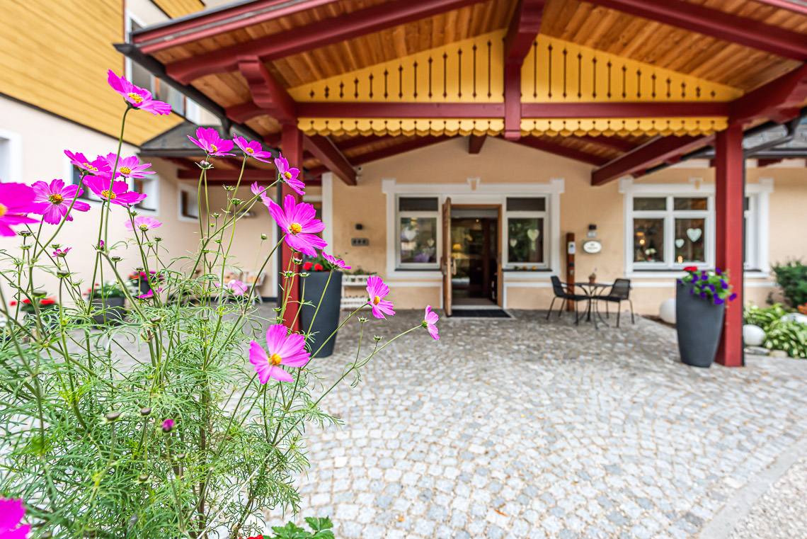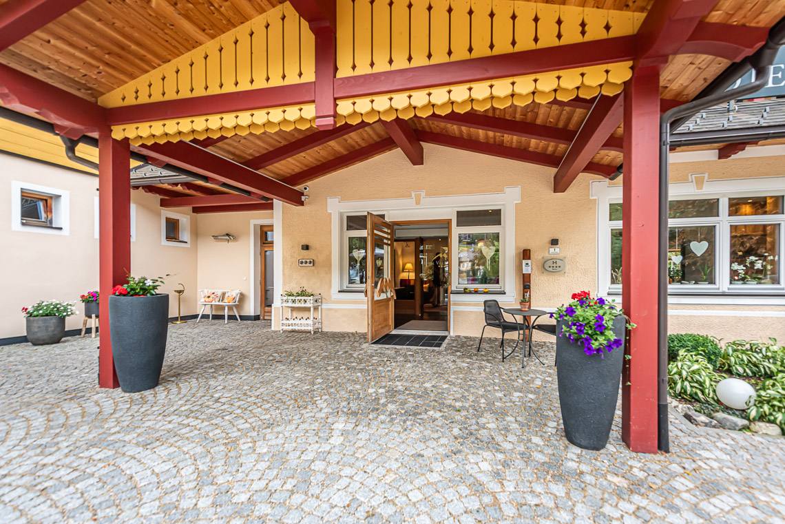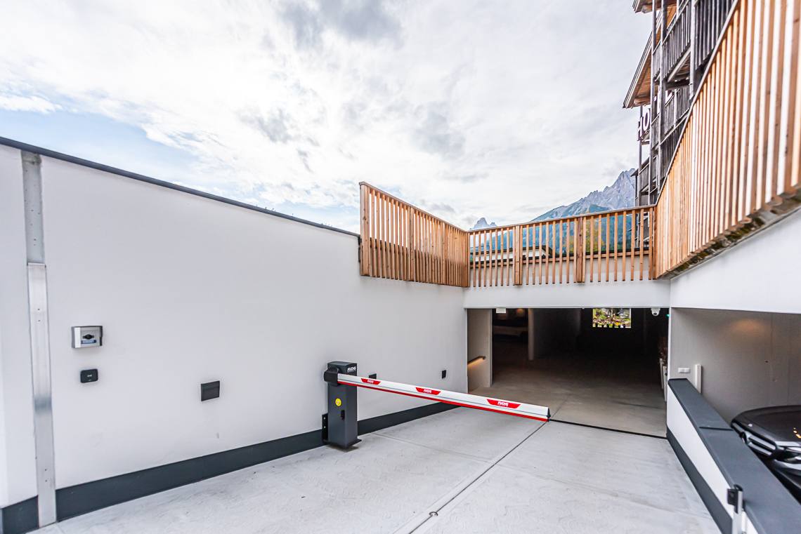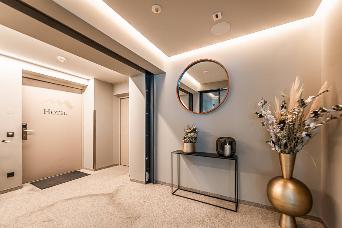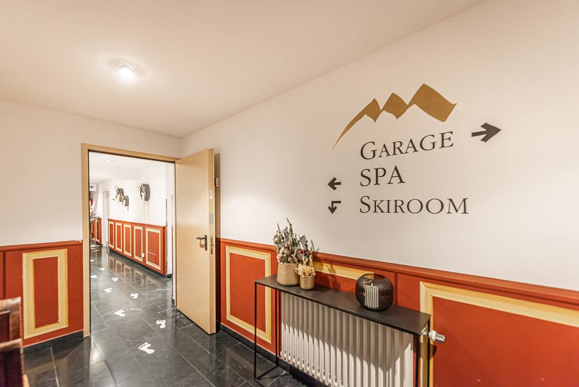 Anmerkung: Der Zugangsweg 1 verbindet den Parkplatz vor dem Haupteingang über einen kurzen leicht ansteigenden Fußweg mit Kiesbelag und Natursteinpflaster direkt mit dem Eingangsbereich. Der Zugangsweg 2 verbindet die Hotelgarage über eine interne Rampe und einen Fahrstuhl mit der Rezeption.