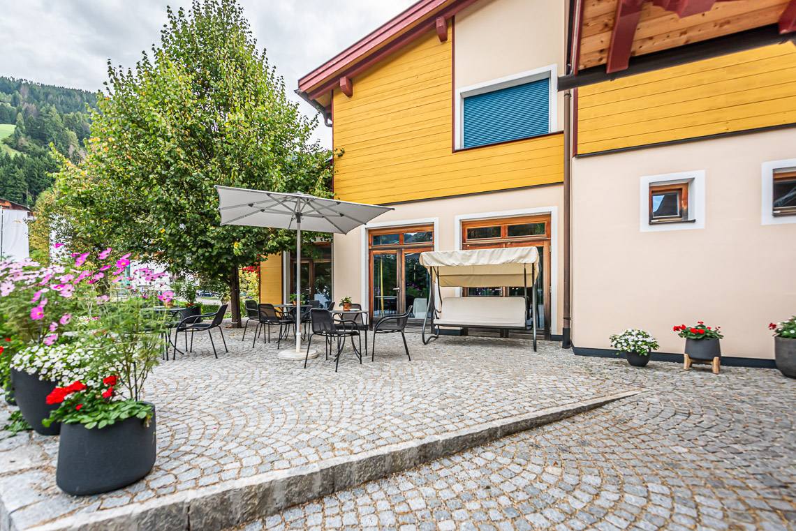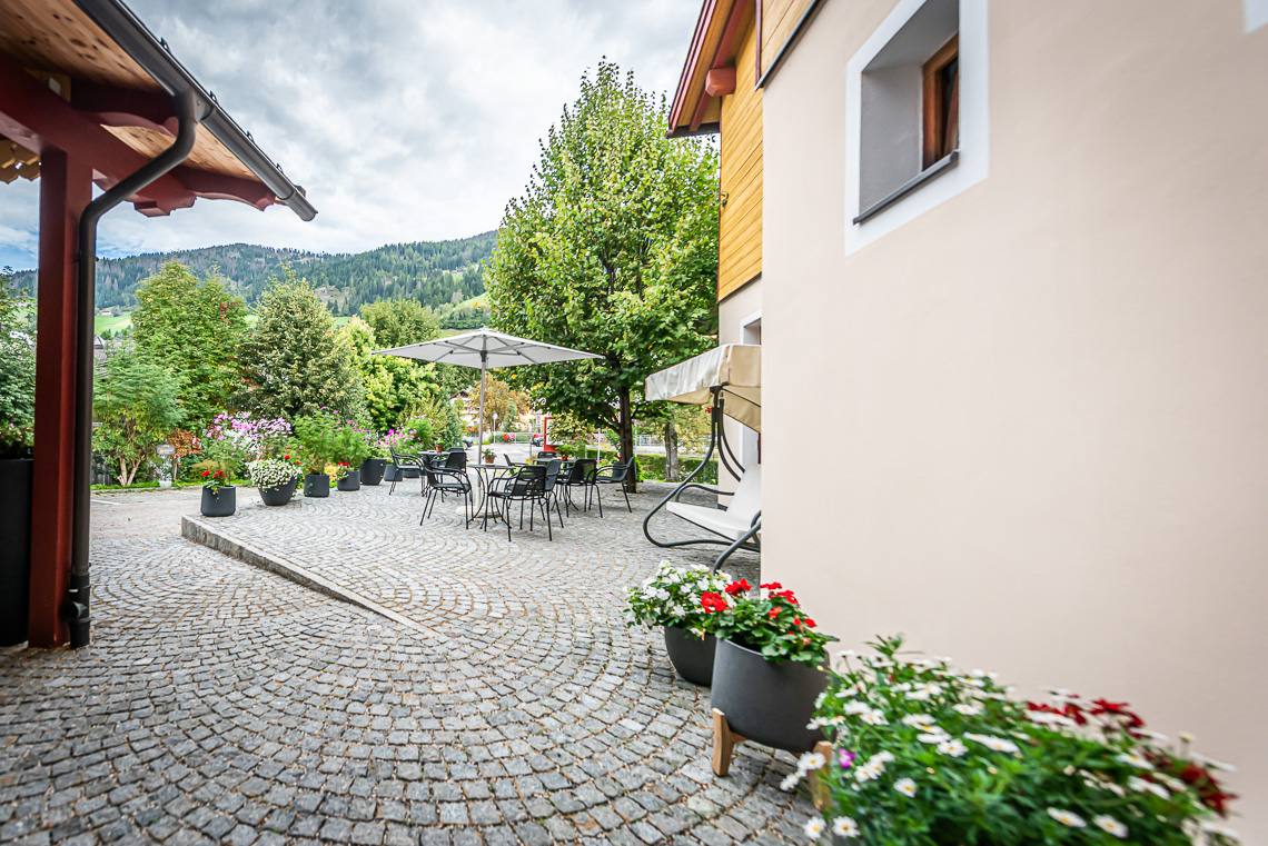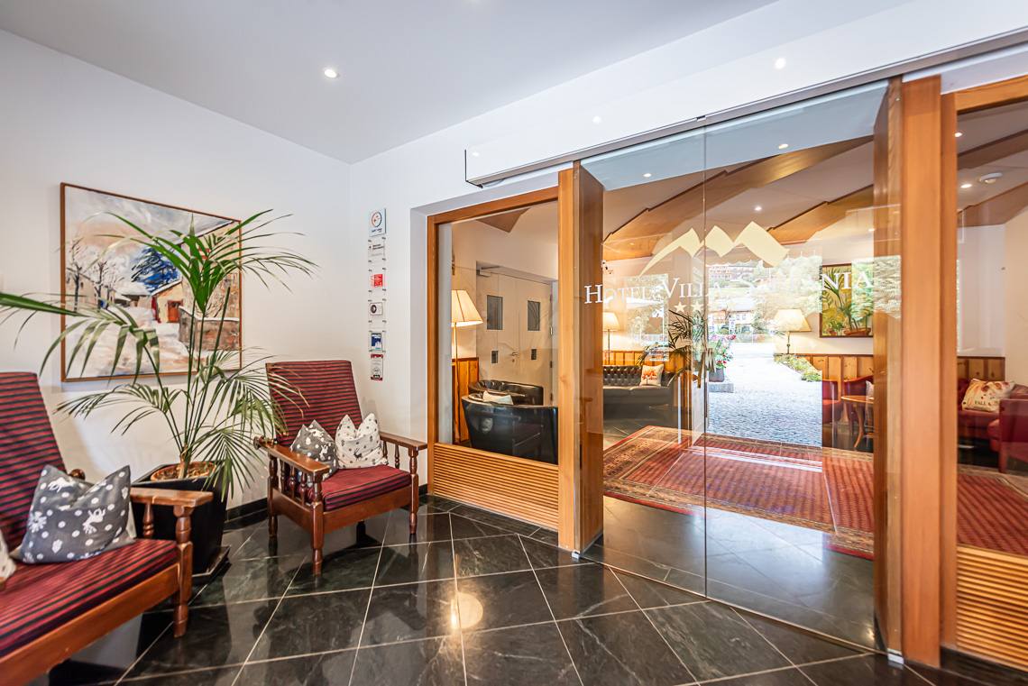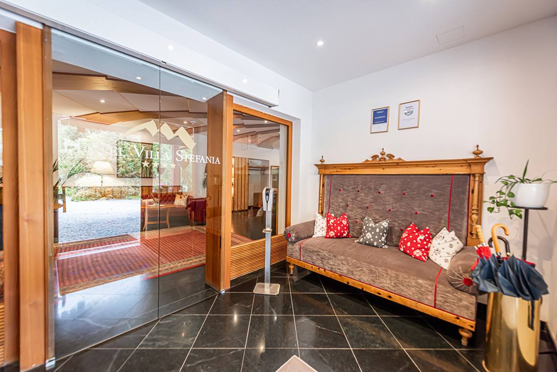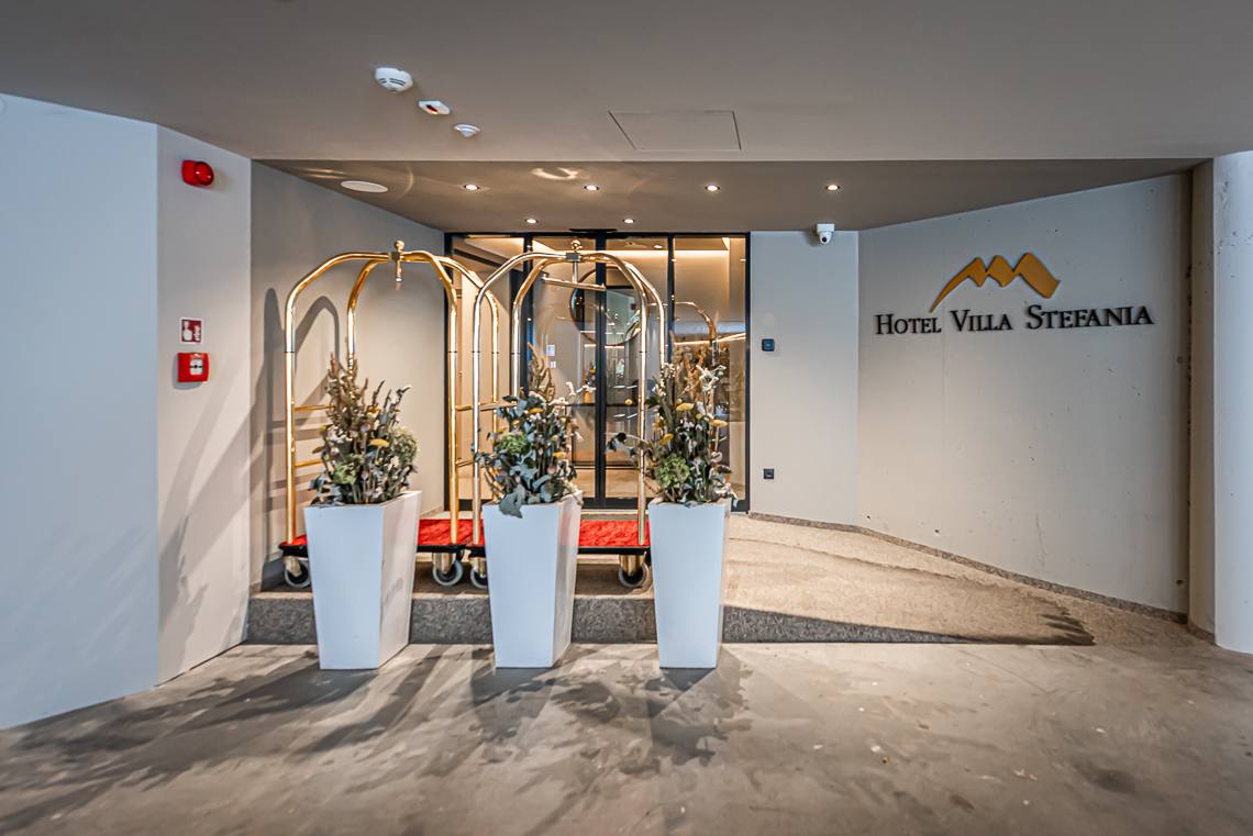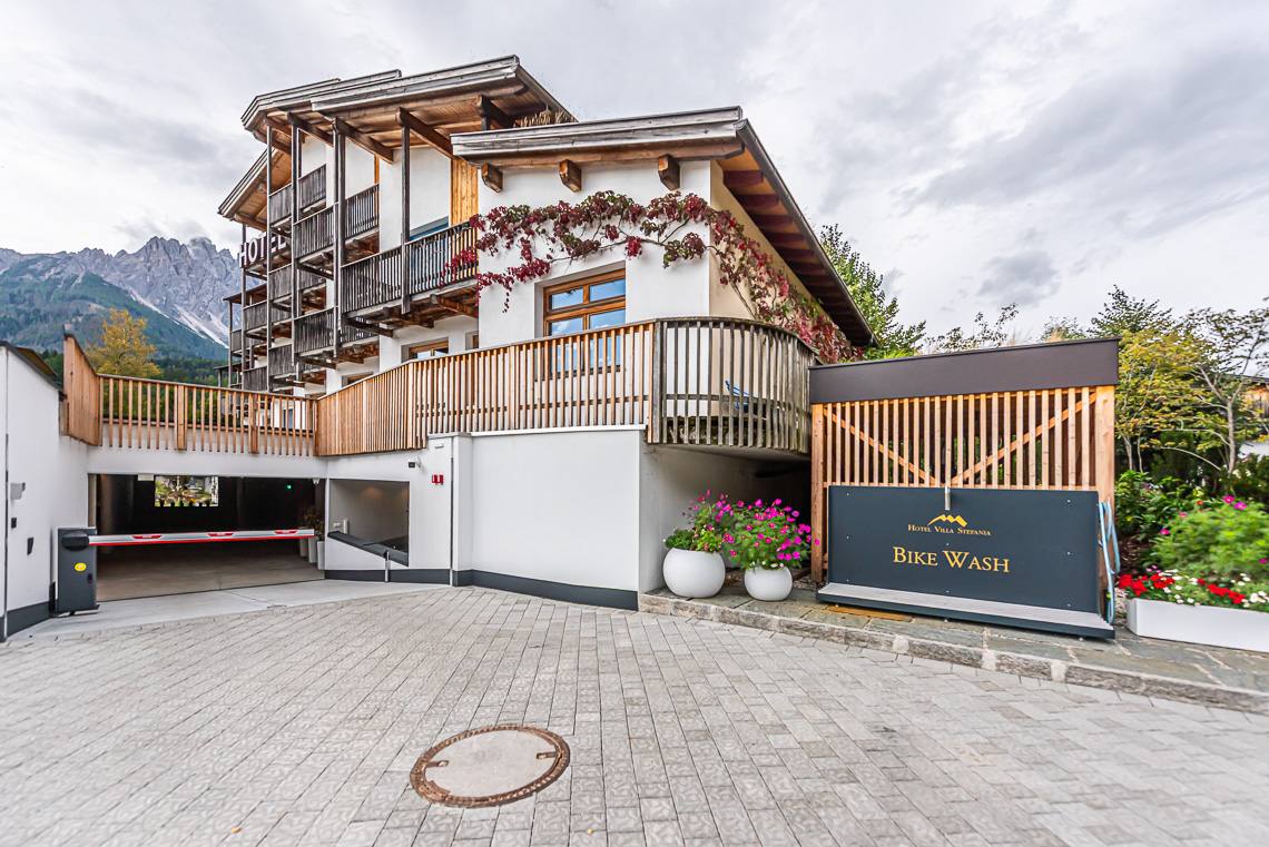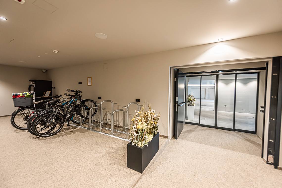 Anmerkung: Der Zugangsweg 1 verbindet den Parkplatz vor dem Haupteingang über einen kurzen leicht ansteigenden Fußweg mit Kiesbelag und Natursteinpflaster direkt mit dem Eingangsbereich. Der Zugangsweg 2 verbindet die Hotelgarage über eine interne Rampe und einen Fahrstuhl mit der Rezeption.