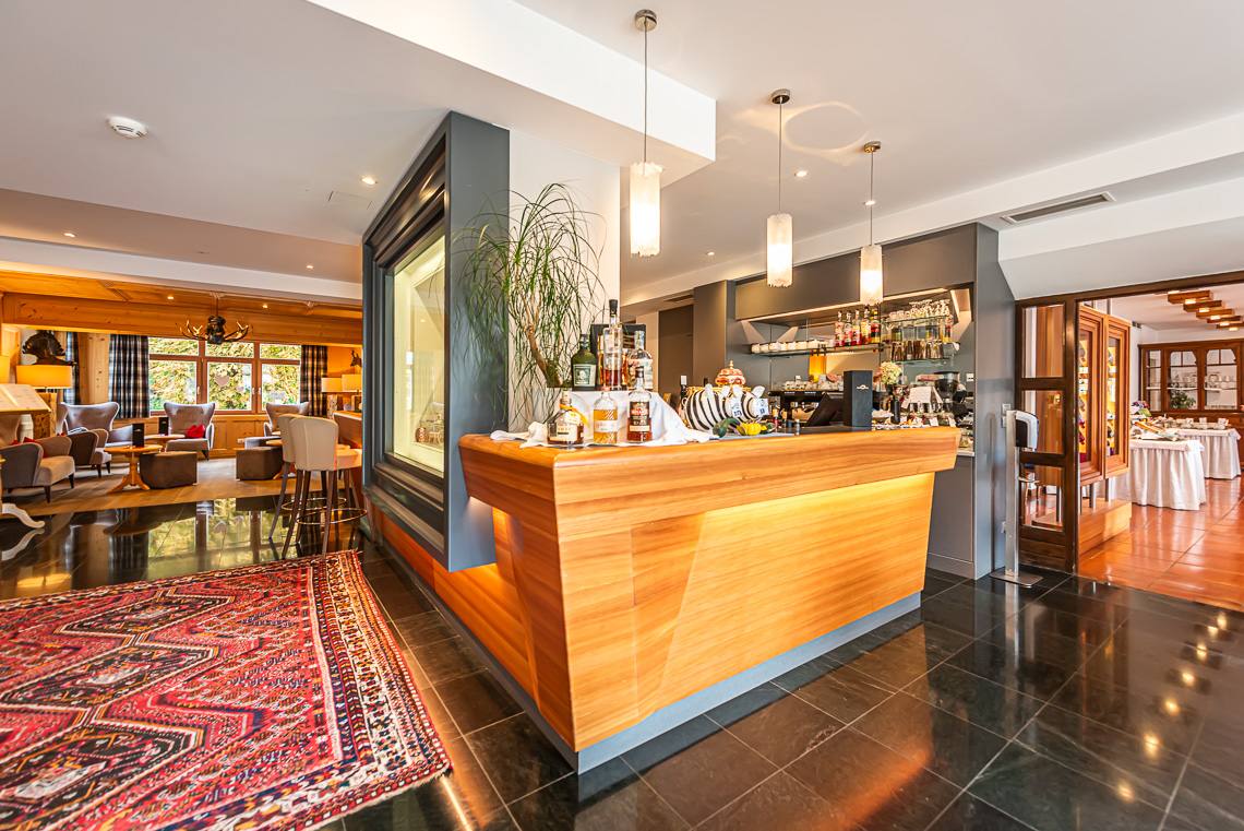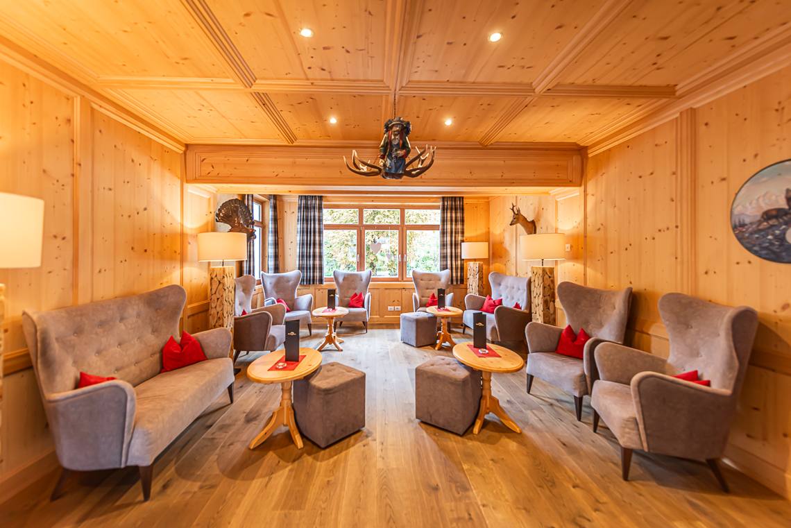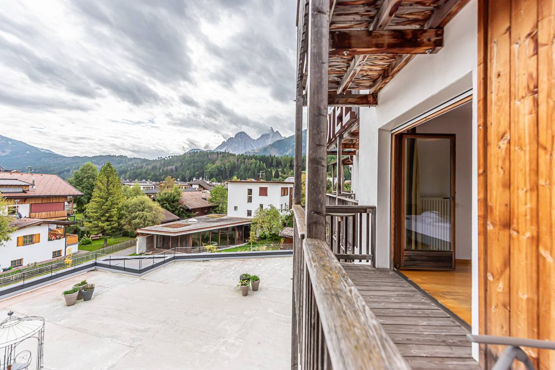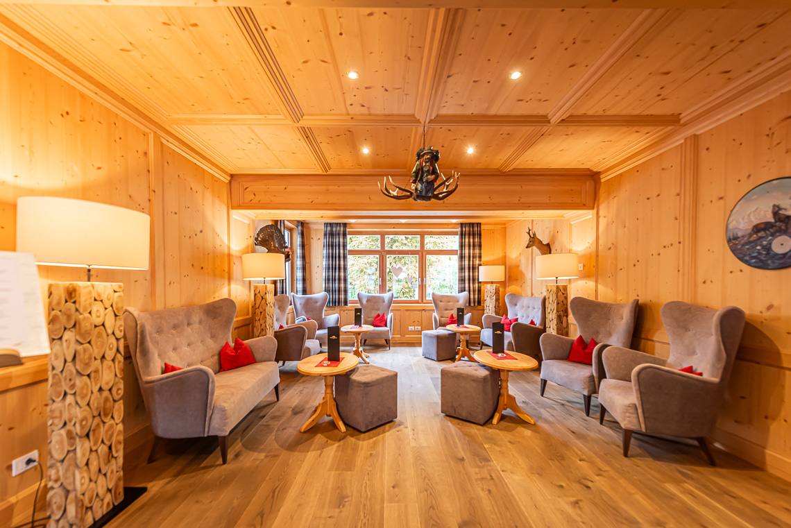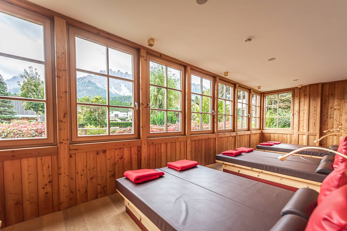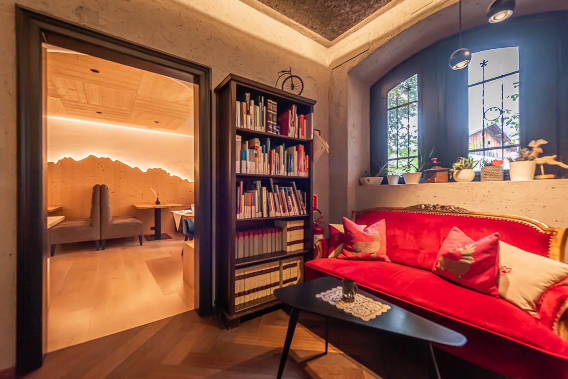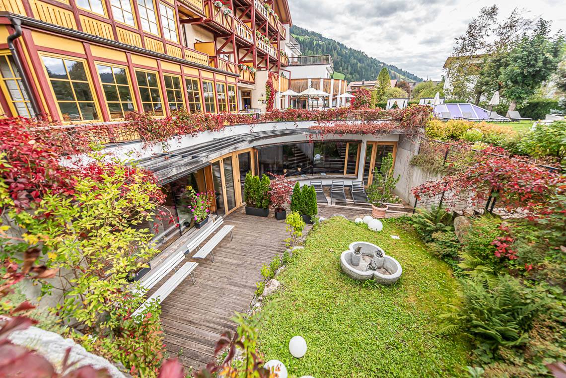 Superando un gradino o una rampa si raggiunge la zona antica dell'edificio, nella quale si trovano la Teestube, una sala lettura con caminetto e la sala biliardo. La Teestube è una piccola parte della storia di San Candido: l'ala più antica dell'hotel risale infatti al 1911, si tratta di una saletta in stile viennese, punto d'incontro ideale per prendere una tisana insieme agli amici. La SPA e la sala giochi per bambini si raggiungono con l'ascensore. La SPA dispone di ampie sale massaggi e trattamenti di bellezza, di un'area sauna con diverse cabine e una saletta relax, una sauna finlandese panoramica di recente costruzione (accessibile dall'interno superando due gradini oppure attraverso la sala fitness tramite una rampa) e infine di una piscina coperta, unico ambiente non accessibile a causa di una rampa di scale. Dalla terrazza si raggiunge l'ampio e soleggiato giardino, dove si trova anche un bel parco giochi per bambini.