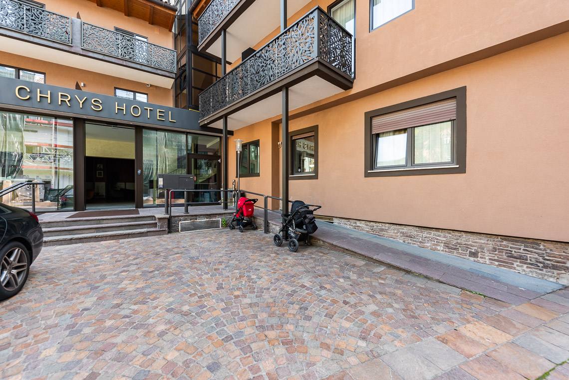 L'Hotel Chrys è dotato di un parcheggio esterno e di un garage sotterraneo. Si consiglia di utilizzare solo il primo piano del garage, poichè è l'unico collegato all'ascensore. Se si accede invece dal parcheggio principale si raggiunge la reception superando una rampa esterna. Sono presenti ben tre ascensori che collegano i vari piani dell'albergo, il bar, la terrazza e la sala tv e ricreativa. Le camere accessibili dispongono di un bagno con wc non attrezzatro e box doccia a pavimento con seggiolino.